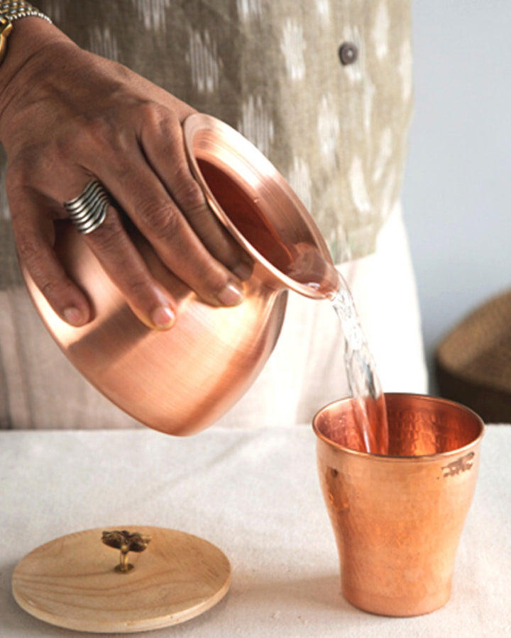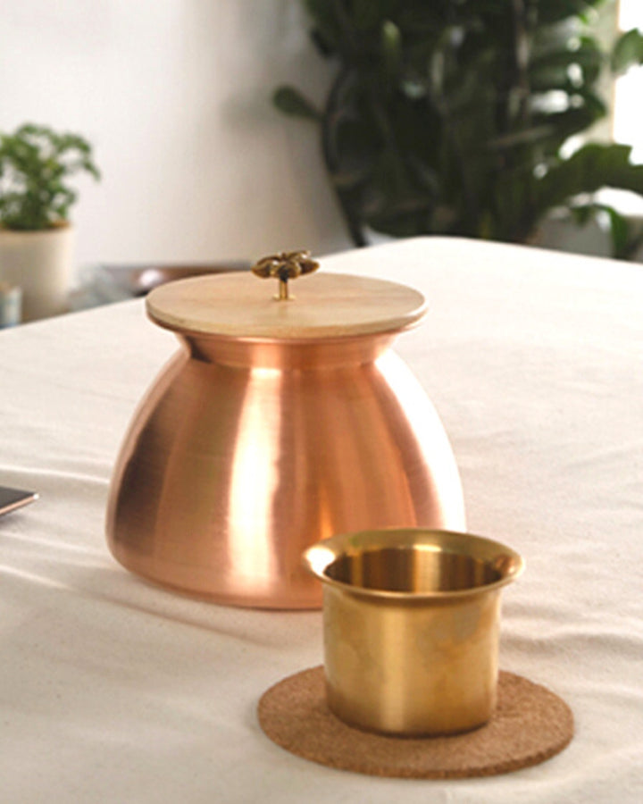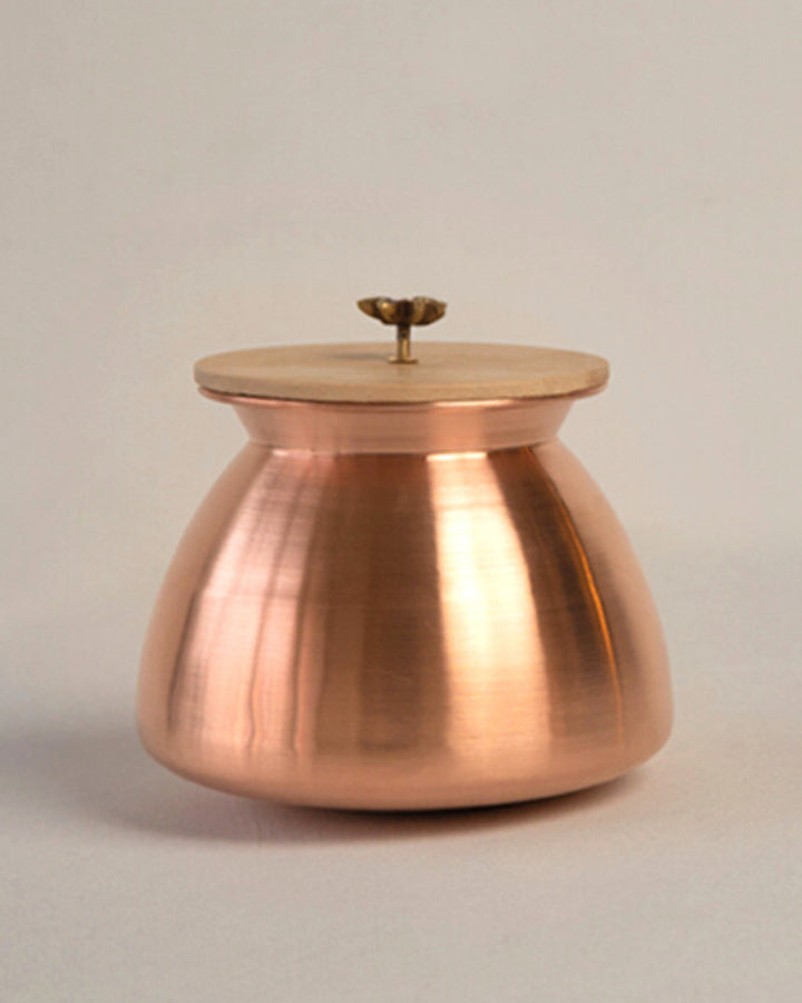 A vintage Lota reimagined for the modern home, this handcrafted copper water container features a clean matt finish and a delicately designed star anise-studded wooden knob, making the lid both stylish and easy to lift.